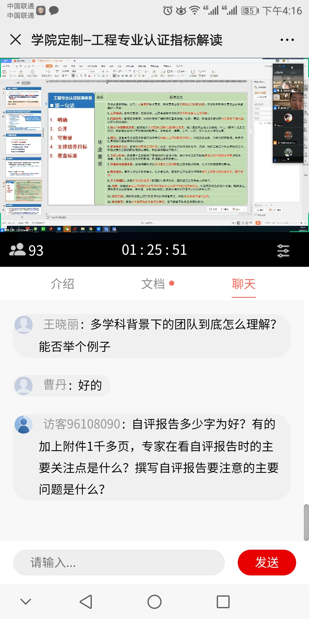 张莉教授从“理解工程教育认证”和“核心指标点解读”两个方面对工程教育专业指标进行解析。讲座持续了两个小时,张莉教授针对“工程教育认证自评报告指导书”具体内容,就指导书中的关键指标如培养目标、毕业要求、复杂工程问题、课程体系及设计等开展详细剖析和解读。与此同时,她以一线教师、认证专家的视角对工程教育专业认证的流程进行介绍,并分享了自身相关经验。报告会内容结束后,进入答疑和交流讨论环节,张教授与直播间新濠娱乐城