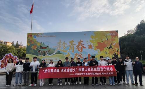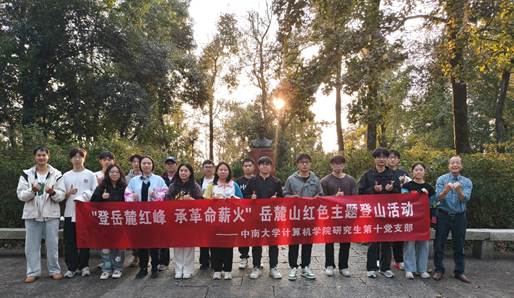 研究生第十党支部秉持“强身健体、拥抱自然、陶冶情操”的理念,组织开展“登岳麓红峰,承革命薪火”红色主题登山活动。支部党员从校本部图书馆前坪集结出发,沿山路徒步至肖劲光铜像纪念园,将红色教育、实践服务与思想研讨有机融合,以实际行动践行初心使命。