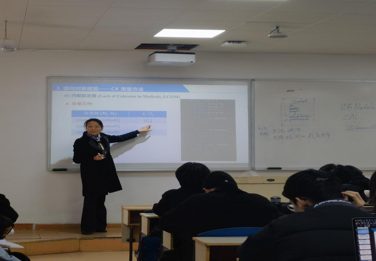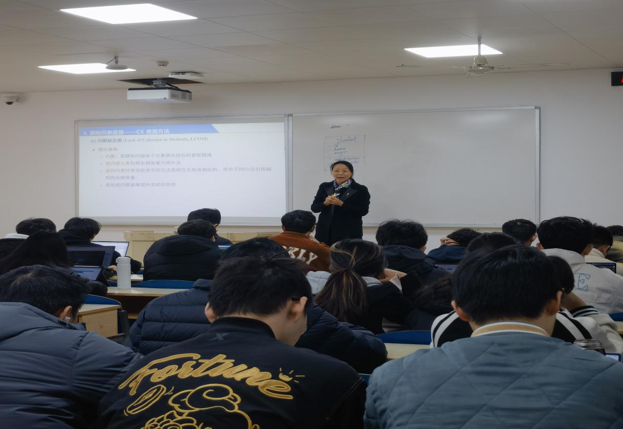 在示范课环节,杨柳老师以“面向对象度量——CK度量方法”为主题展开教学。主要讲授面向对象度量中的CK度量方法,以“教务管理系统”的类图设计与代码实现为案例,介绍了CK度量方法中的六个度量点的度量模型与应用意义。对于其中的内聚缺乏度(LCOM)的度量模型,杨柳老师结合应用案例,启发同学们思考存在的问题,并引入最新学术论文中的多种改进方法。一方面通过导入学科前沿知识,以培养同学们解决复杂问题的综合能力与高阶思维;另一方面有效融入课程思政,鼓励同学们在学习过程中要敢于质疑勇于钻研,以激发他们的思辨能力与创新意识。讲授过程中,结合课程知识图谱对本次课程内容所涉及的前导后续课程的知识点进行融会贯通,包括面向对象程序设计、软件工程、设计模式、软件过程改进等,以加深学生对学科知识的理解。