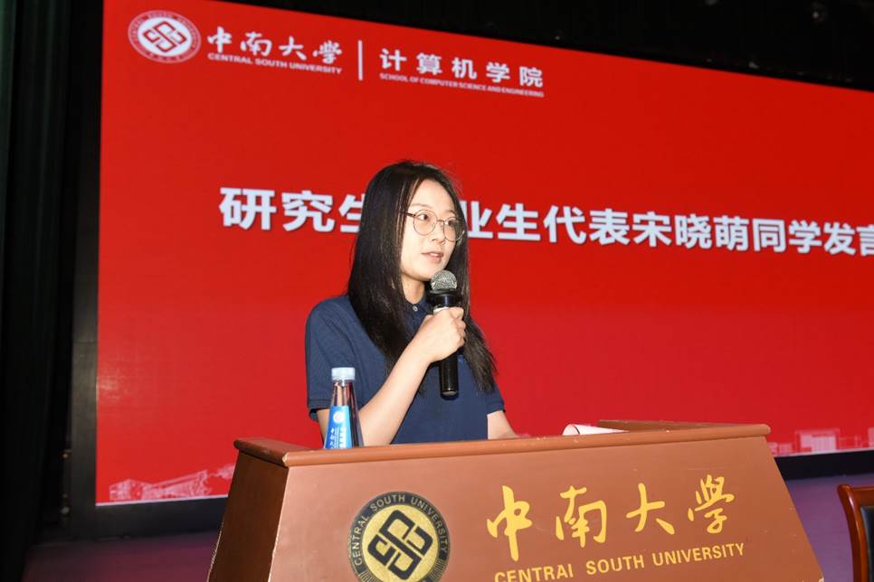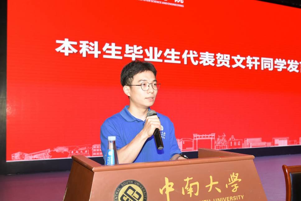 毕业生代表发言环节,本科生毕业生代表贺文轩分享了自己四年求学期间的成长经历,感恩母校的悉心培育、师长的谆谆教导与同窗的携手同行,表示将带着中南赋予的智慧与力量,勇敢迎接未来挑战;研究生毕业生代表宋晓萌从自己学生和辅导员“双重身份”的独特视角,分享了“主动而为、独立思考、常怀感恩”的成长感悟。她结合辅导员工作经历,讲述了与学生朝夕相处的温暖故事,以及在育人过程中的自我成长,呼吁毕业生们以感恩之心奔赴山海,在新征程中传递温暖、照亮他人。