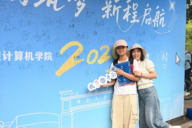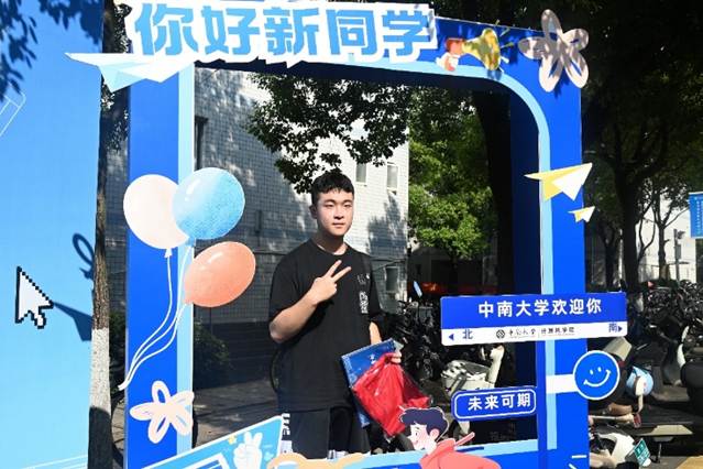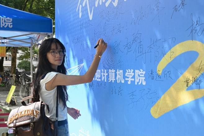 迎新展板上写下了名字并合影留念,纷纷表示对即将开启的大学生活充满期待。