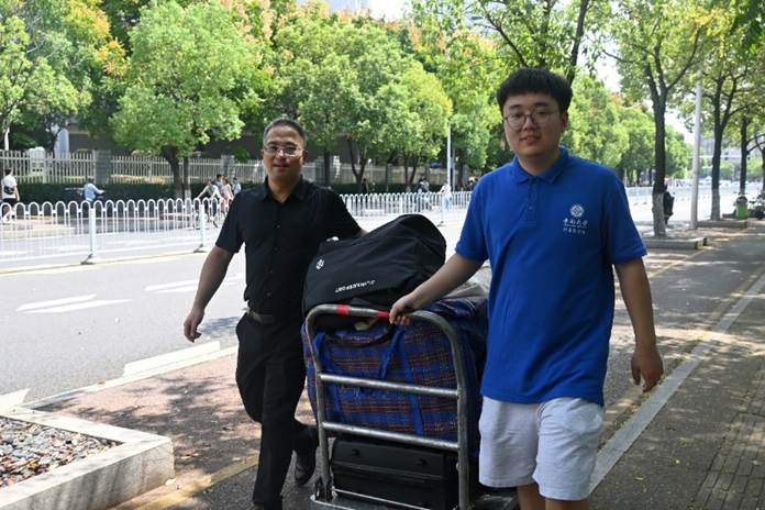 早上7点,身着统一服装的志愿者队伍已集结完毕。炎炎烈日下,从校门口的行李搬运、路线引导,到报到点的信息核对、物资发放、生活答疑,学生志愿者始终热情地为新生提供全流程帮助。