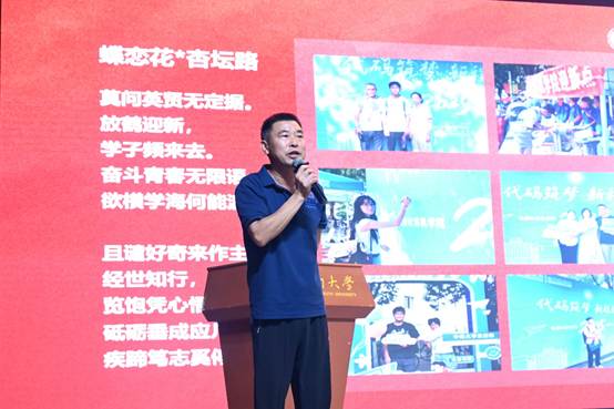 “立德树人”的教学理念,提出“学会做人、学会生活、学会审美、学会劳动、学会健体”的成长建议,希望新生们在大学中不仅收获知识,更能塑造健全人格,并以诗词寄语新生: