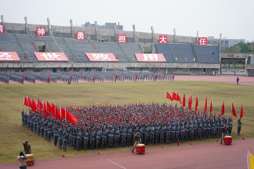 首先登场的是由三营同学组成的匕首操方阵。队员们口号响亮、动作整齐,手持匕首,挥洒自如。演至高潮,方阵迅速变换队形,以红布为墨,在绿茵场上拼写出“夺”“旗”“建”“功”四个大字,将现场气氛推向高潮,展现了计算机学子深厚的爱国情怀与昂扬斗志。