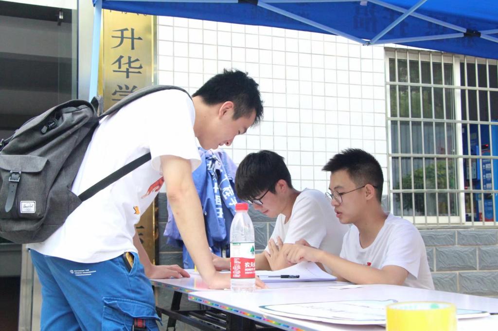 学生会各级干部、志愿者分别在升华学生公寓28栋及南五舍楼下搭建迎新棚,设置迎新点,进行签到、咨询、引导工作并发放新生资料袋。