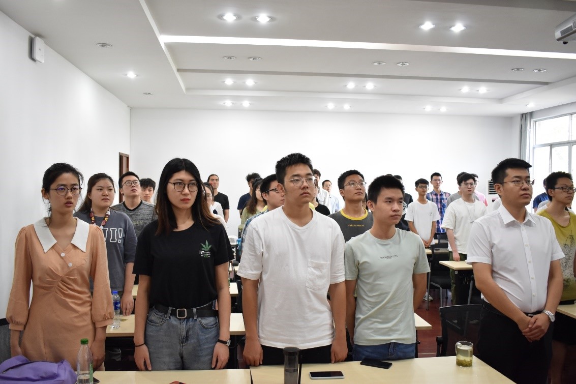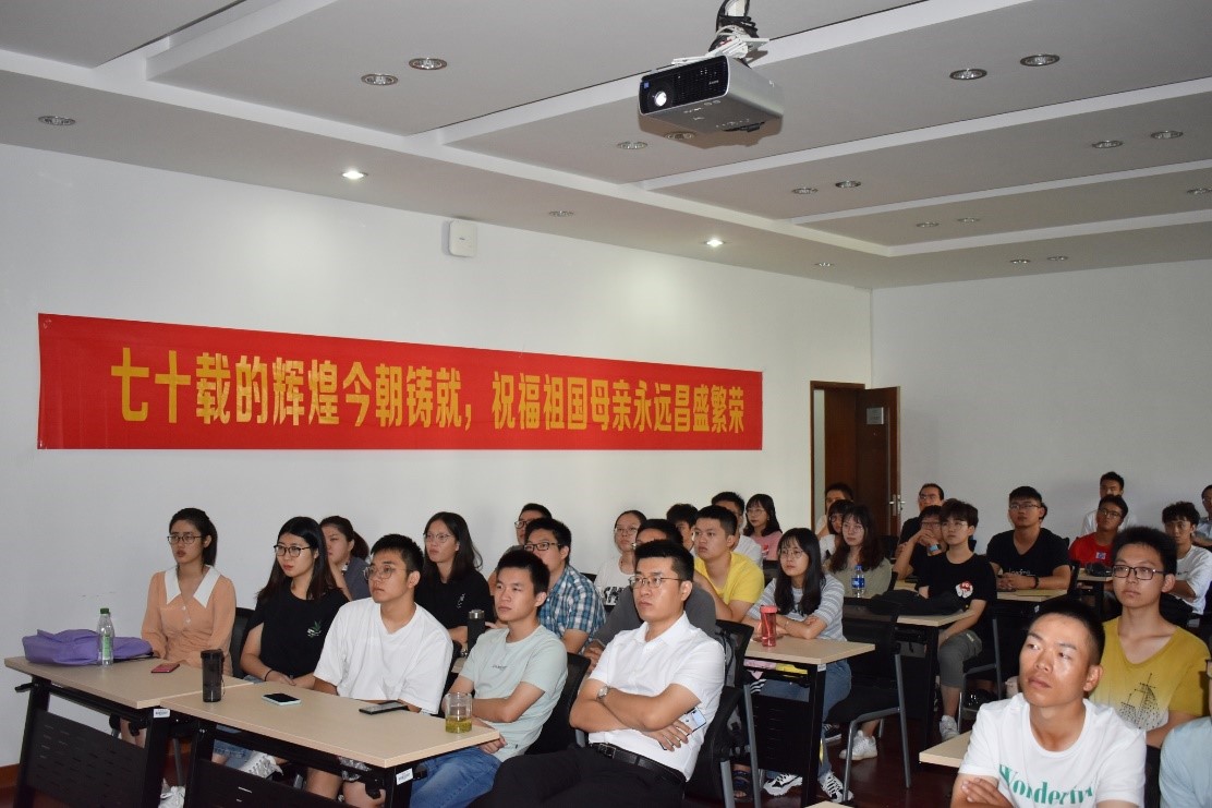 上午九点,计算机楼313室内气氛庄重又欢欣。写有“七十载的辉煌今朝成就,祝福祖国母亲永远繁荣昌盛”的条幅悬挂在墙上,一面面小红旗在同学们手中飘扬。阅兵仪式正式开始之前,看到屏幕里有关群众游行自行车方阵的采访,孙龙志老师与大家互动,畅聊不同年代青年与祖国的故事。阅兵开始,礼炮响起,全体学生肃立凝视,高唱国歌表白祖国。阅兵过程中,大家的目光真挚而热烈,当阅兵活动的精彩镜头出现时,一起情不自禁地鼓掌,“院校科研方队”、“跨越世纪方队“等方队出现时发出阵阵惊叹。