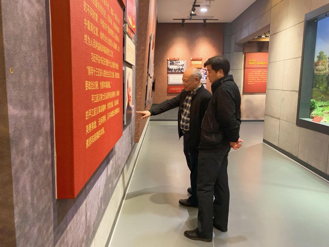 随后同志们进入“永恒纪念,世代传承”缅怀厅追忆先贤伟业。1928年7月,在中国共产党的领导下,彭德怀、滕代远、黄公略等同志在湖南平江发动了威震湘鄂赣,声撼全中国的平江起义。平江起义部队将士为理想信念前仆后继,为人民幸福奋不顾身,甚至献出宝贵的生命。他们的英雄事迹和革命精神时刻感动着世人,我们永远不会也不应忘记中国革命的胜利是中国共产党和中国人民用鲜血和生命换来的,在新的时代更应缅怀先辈伟业,不忘革命初心。