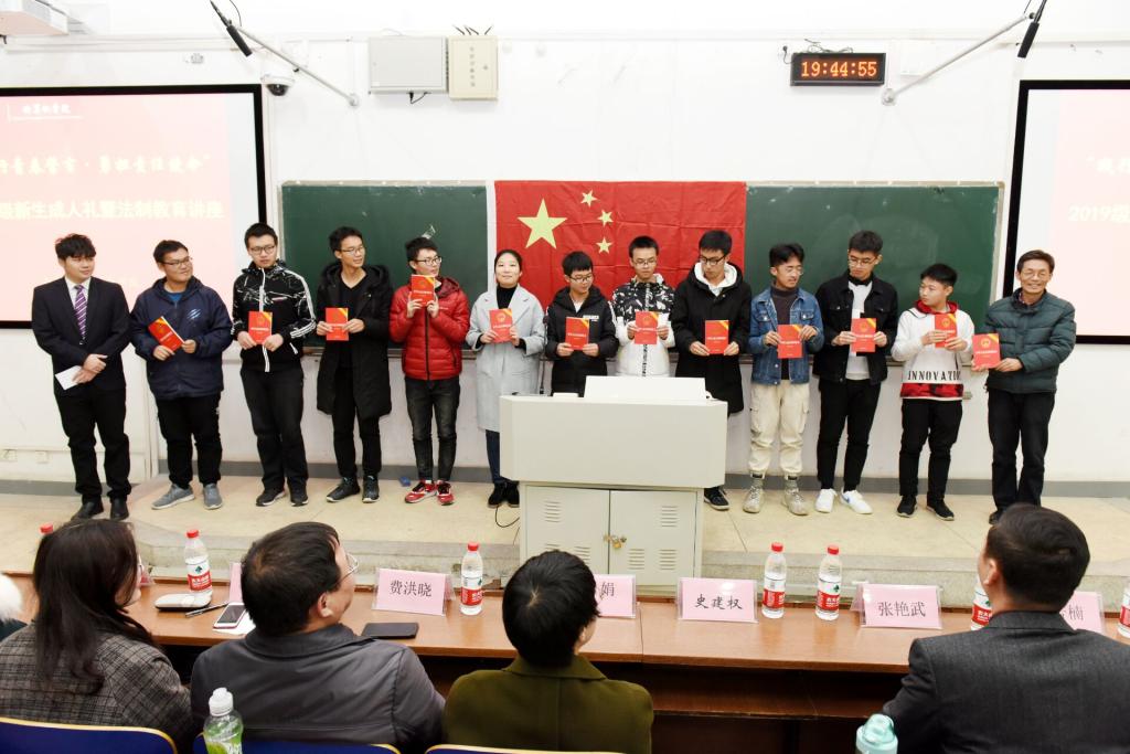 为每位同学送上了一本《宪法》,同时,史建权书记也对我们提出了殷切期望,他以此寄语:成年的背后,在依法享有广泛权力和自由的同时,更要挺直腰杆坚强承担起一个公民应尽的义务,作为新时代大学生,我们要把自己的理想同祖国富强、民族振兴、人民幸福的中国梦紧密结合起来,承担起历史赋予我们的责任,努力践行社会主义核心价值观,做一个道德高尚、品行高贵的人,做一个认真学习,有强大本领的人,做一个对国家富强、人民幸福有贡献的人,有一个爱国爱党、遵纪守法、爱岗敬业、诚信友善的人,时刻铭记对自己负责,对家人负责,对社会负责,对国家负责,一步一个脚印,勇敢前行。
