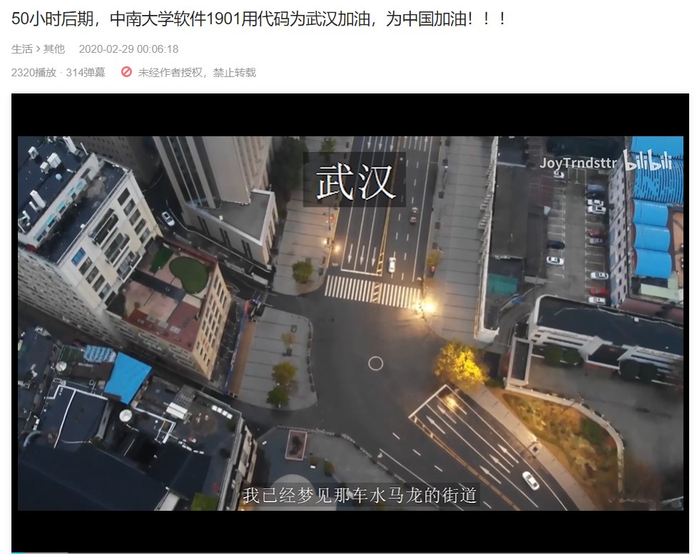 软件工程1901班制作的战“疫”特别视频上传网络后,引起强烈反响。视频中1901班全体同学通过编写祝福小程序的形式为武汉加油,视频上线后,引发众多网友点击、评论,截至发稿时,视频点击率已突破2300次,弹幕留言超过300条。