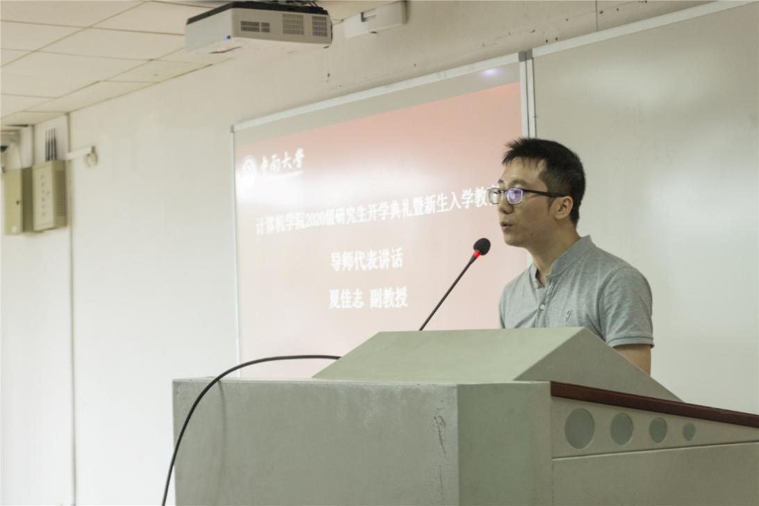 接着,夏佳志教授结合自己做研究生时的亲身经历,将自己的经验总结分享给新生。夏老师建议新生尽早规划好研究生时期目标,与导师积极沟通,共同研究课题,保持自身发展与团队目标同行,并且希望学生们能感受到科研魅力。新生代表王玉锋同学分享了自己与中南大学相遇的经历,并鼓励同学们要不怕辛苦,积极科研,热爱生活。