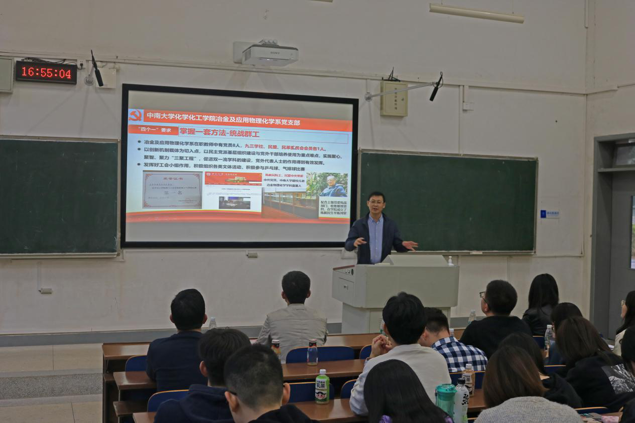 冶金与应用物理化学系党支部书记胡久刚进行经验交流。胡久刚老师是冶金及应用物理化学系副主任、学科带头人,现任中南大学首批样板党支部——化学化工新濠娱乐城