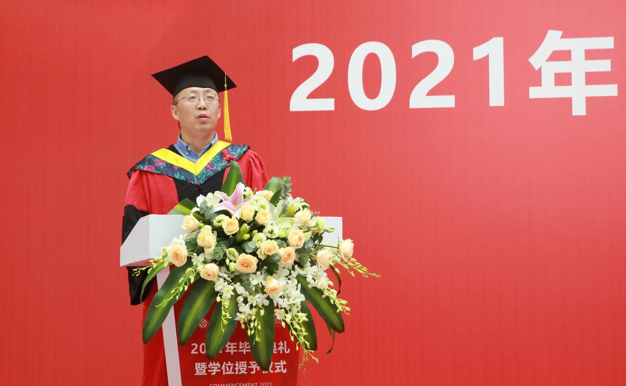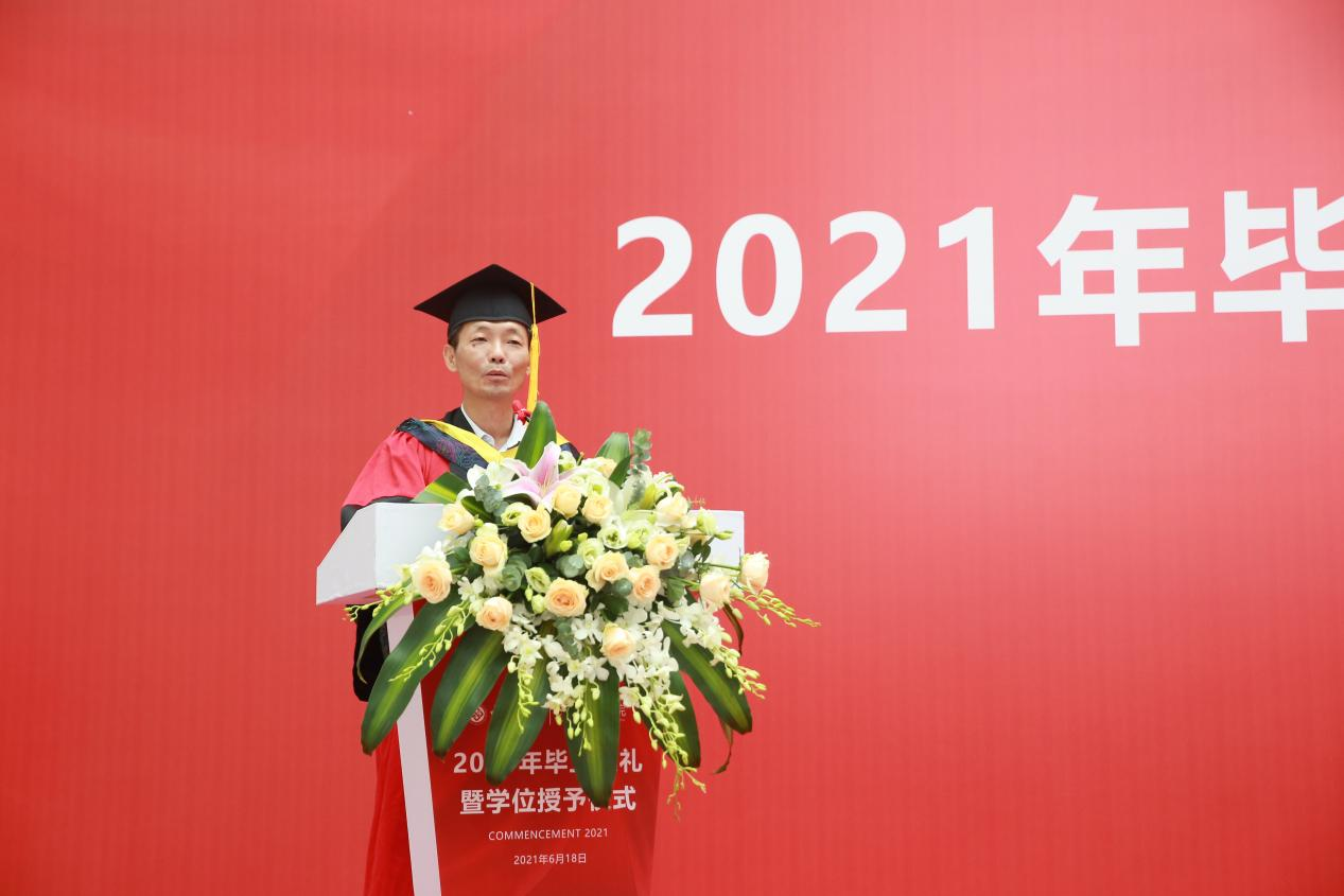 党委书记陈志刚教授发表讲话。陈书记提到,毕业生们已经拥有了人生奋斗的入场券,更需要担起社会的责任,让自己的青春奋斗与祖国的需求相结合。陈书记还强调到,成功是努力奋斗的结果,要坚定理想信念,树立人生目标,在未知旅途的征程里不断奋进。希望毕业生们能够带着学校与老师的祝福在人生道路上大放异彩。