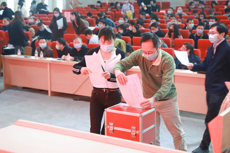 在民主测评环节中,本着公平、公正、公开的原则,工作人员现场展示了投票箱,而后全体教职工参与了民主测评投票。