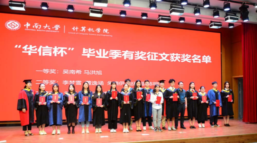 院长王建新、副院长李敏、华信软件股份有限公司董事长谢向东先生给17位获奖同学颁奖并一起合影留念。