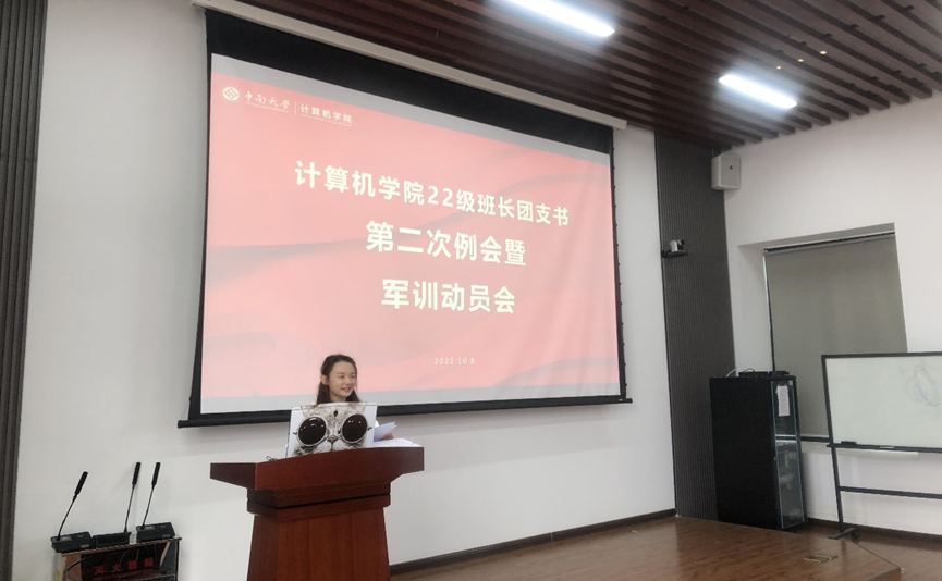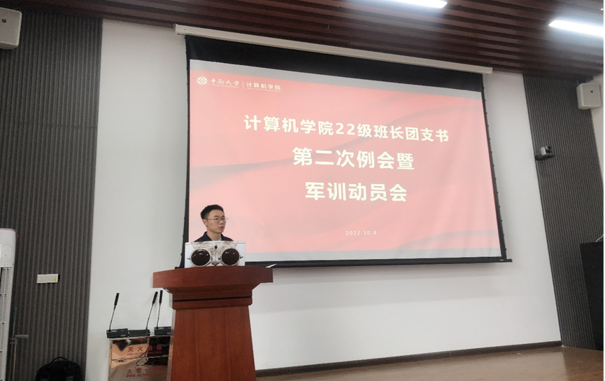 22级军训动员大会在中南大学信息楼535报告厅展开,军训指导员陈司宇、刘烁烁、何星霖三位老师,各连排军训教官以及22级全体班长、团支书出席了本次动员大会。