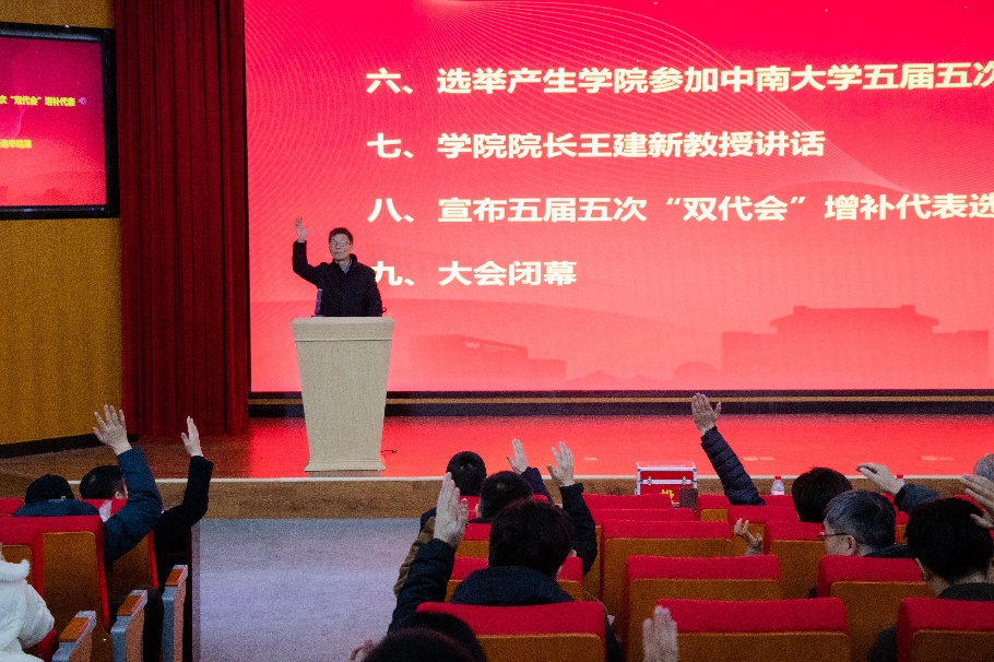 五届双代会代表(增补)选举大会由院党委副书记、工会副主席史建权主持,史建权副书记先向大会介绍了五届五次“双代会”增补代表情况,先后表决通过了出席中南大学五届双代会代表选举办法、计票人和监票人,而后与会教职工代表参与了选举投票。经大会选举,蒋建湘同志被推选为中南大学五届五次双代会增补代表。