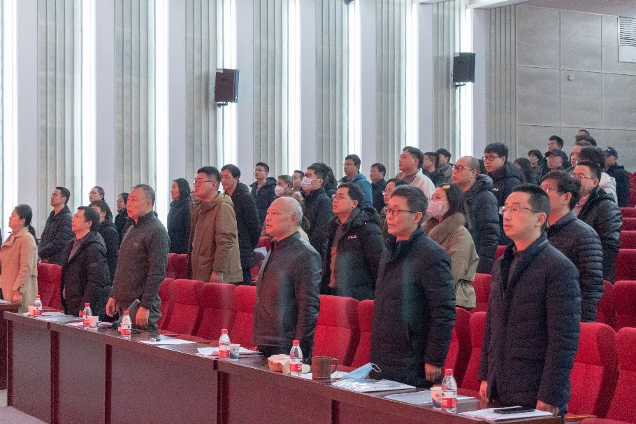 考核述职和民主测评会由院长王建新主持,会议在庄严的国歌声中拉开序幕。