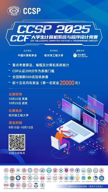 2025 CCF CCSP竞赛将于2025年10月22~23日在黑龙江哈尔滨举办。其中,第一天为比赛日,届时将有来自全国各地近500位计算机专业优秀学子同台竞技;第二天下午举办竞赛颁奖典礼,CCF将为获奖选手进行现场颁奖。凡是参加现场竞赛的选手均可免费参加于10月22~25日在哈尔滨举办的CNCC2025大会。