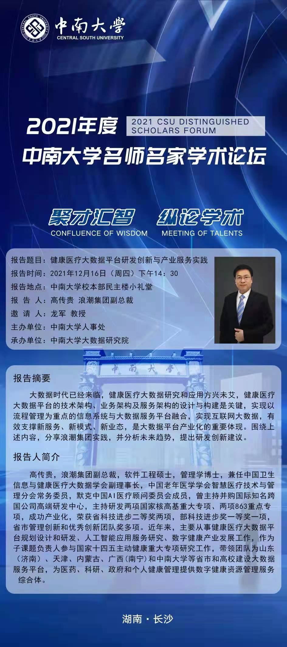 中南大学名师名家学术论坛-健康医疗大数据平台研发创新与产业服务实践