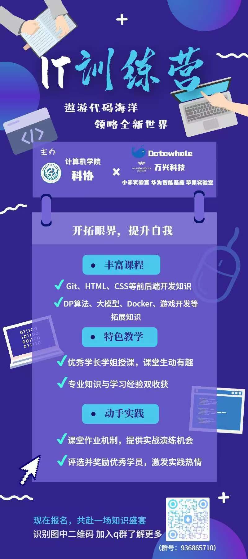 大学生科协特此筹办“IT训练营”活动,并于本周日正式开班,期待同学们踊跃报名。现将具体安排通知如下: