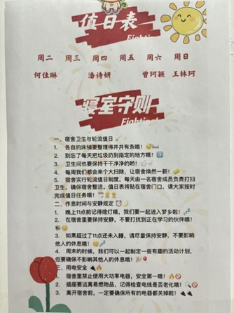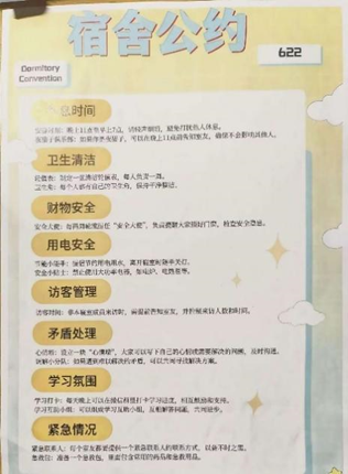 活动初期,各寝室积极响应号召,积极踊跃参与。通过参与不同寝室的寝室公约制订,此次负责人发现各寝室基本做到如下几点: