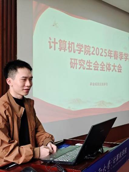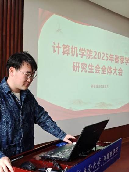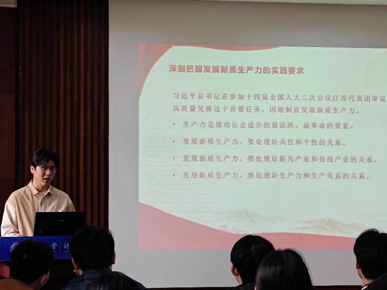 会上,研究生会主席叶伟同学结合两会热点,重点解读了新质生产力、产业安全、绿色发展等议题。习近平总书记在参加十四届全国人大三次会议江苏代表团审议时强调,科技创新和产业创新,是发展新质生产力的基本路径。抓科技创新和产业创新融合,要搭建平台、健全体制机制,强化企业创新主体地位,让创新链和产业链无缝对接。叶伟同学通过阐释“人工智能+”“以模制模”等与计算机专业息息相关的政策,帮助同学们理解国家战略与个人成长的契合点。