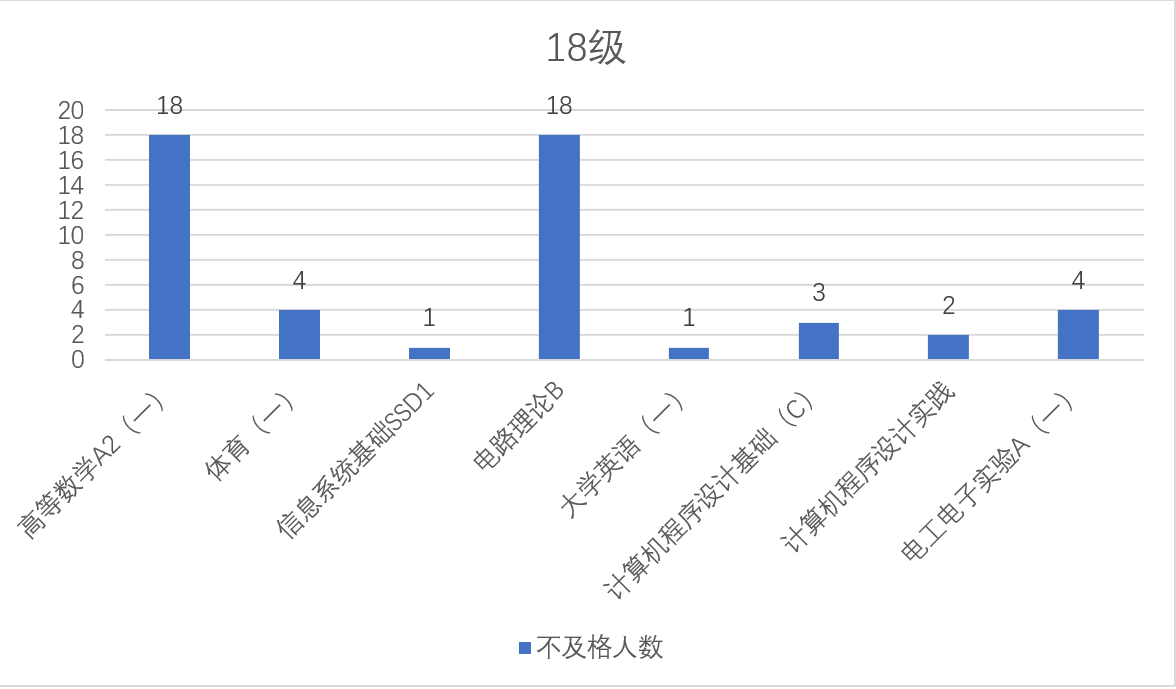 18级不及格人数主要集中在高等数学和电路理论,看来有不少同学在高数这一科目上挂科。希望18级的同学能尽快找到自己学习的节奏,提升自己的学业。