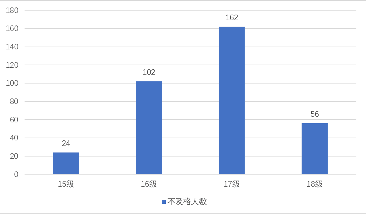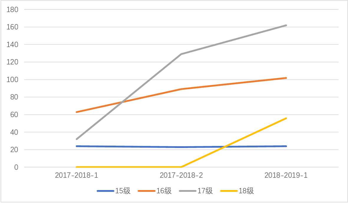17级和16级挂科人数偏多,15级挂科人数最少。16级和17级同学的学习态度急需提高;15级同学学习态度端正,应该继续努力保持;18级同学初入大学,学习较为认真,但仍有些学生没有及时调整好,还需要继续适应并提升自己。