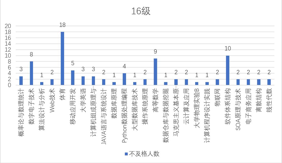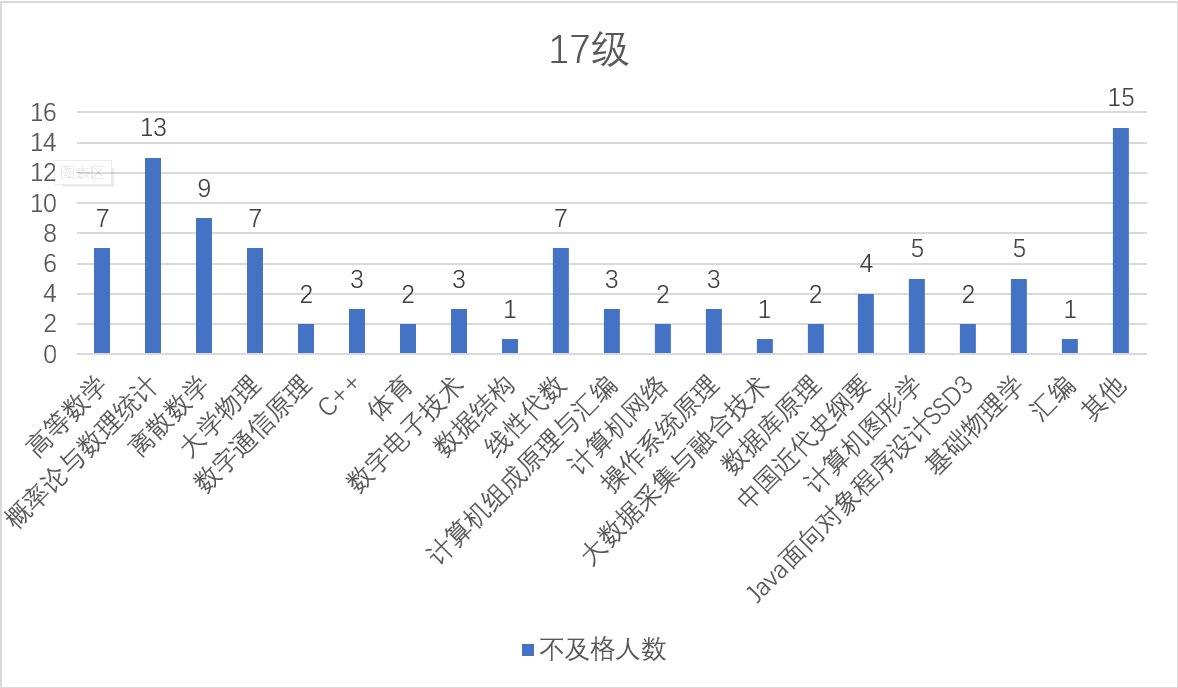 17级不及格人数较多,尤其是在概率论、线代、离散等科目不及格人数较多,希望17级的同学能够在这些科目上多下一些功夫,以减少挂科人数。
