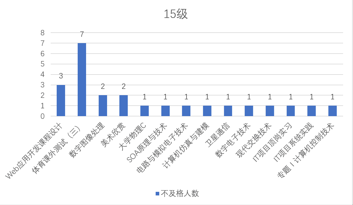 15级同学挂科主要集中在体育以及专业水平高的专业技术课上,建议广大同学加强体育锻炼,并勤加学习专业知识,做到德智体美劳全面发展。