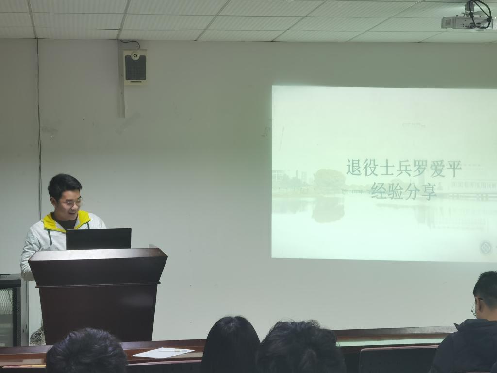 紧接着是退役士兵罗爱平同学讲话,他分享了自己的经验,介绍了征兵相关政策和情况,鼓励有意愿有想法的同学积极响应国家号召入伍参军。