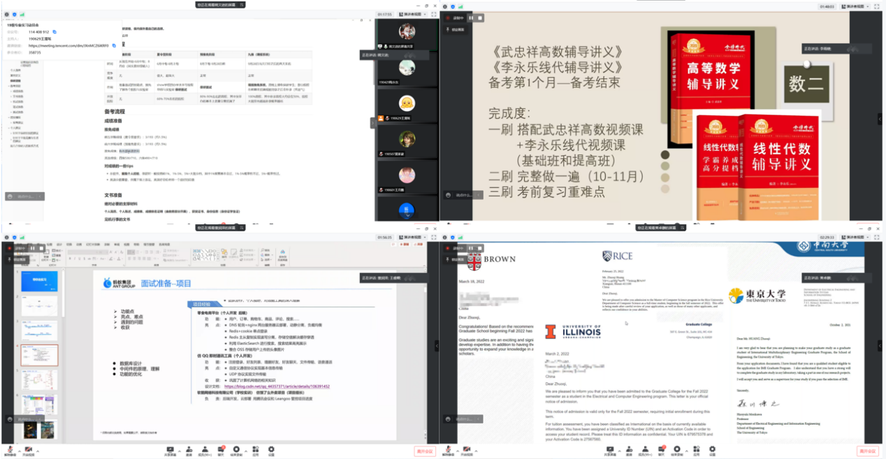 的姚文进学长向大家介绍了如何保研与自己的保研经历。凭借418分的傲人成绩成功上岸的李雨捷学姐向同学们介绍了考研规划与时间安排。以sp的评级拿到了蚂蚁集团offer的董润泽学长向同学们介绍了实习面试的方法与技巧。即将前往伊利诺伊香槟大学分校就读的黄卓麒学长向同学们介绍了出国留学的过程方法与当前可能面临的种种情况。
