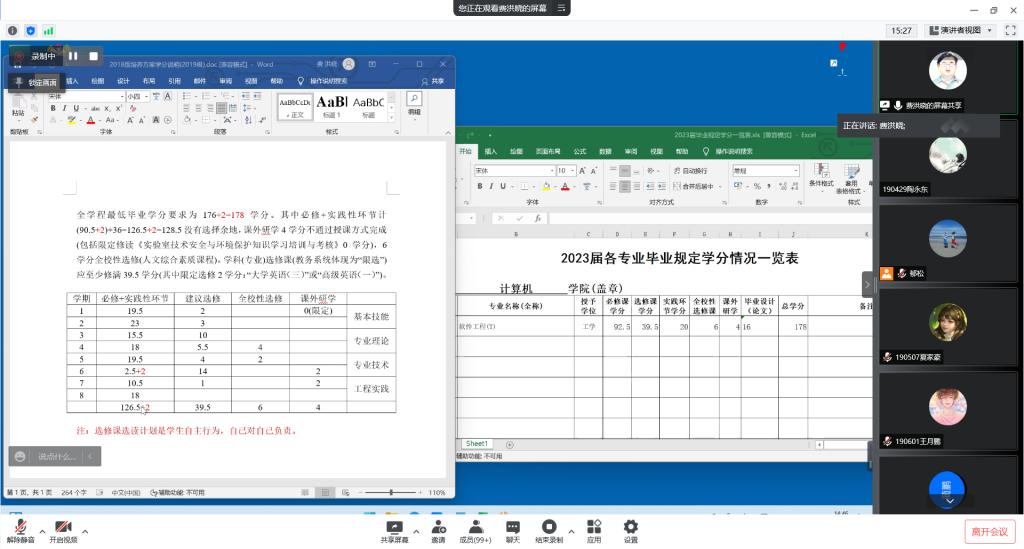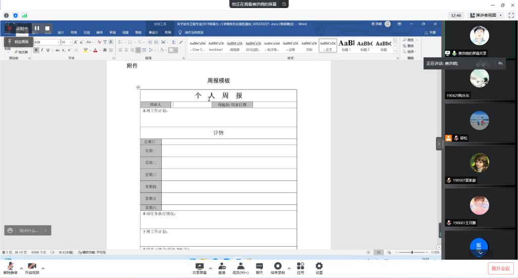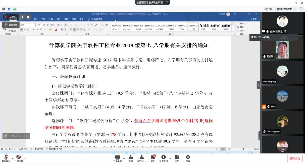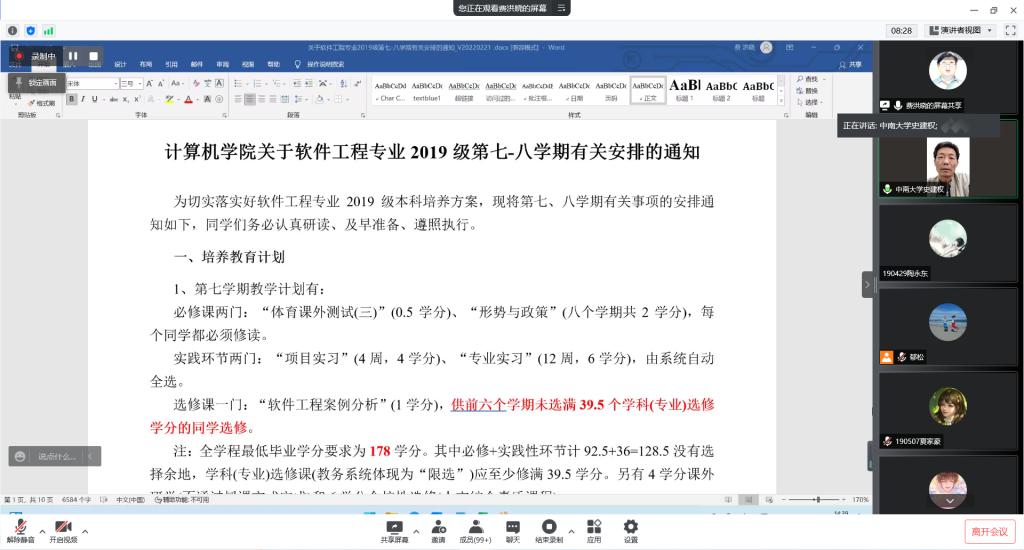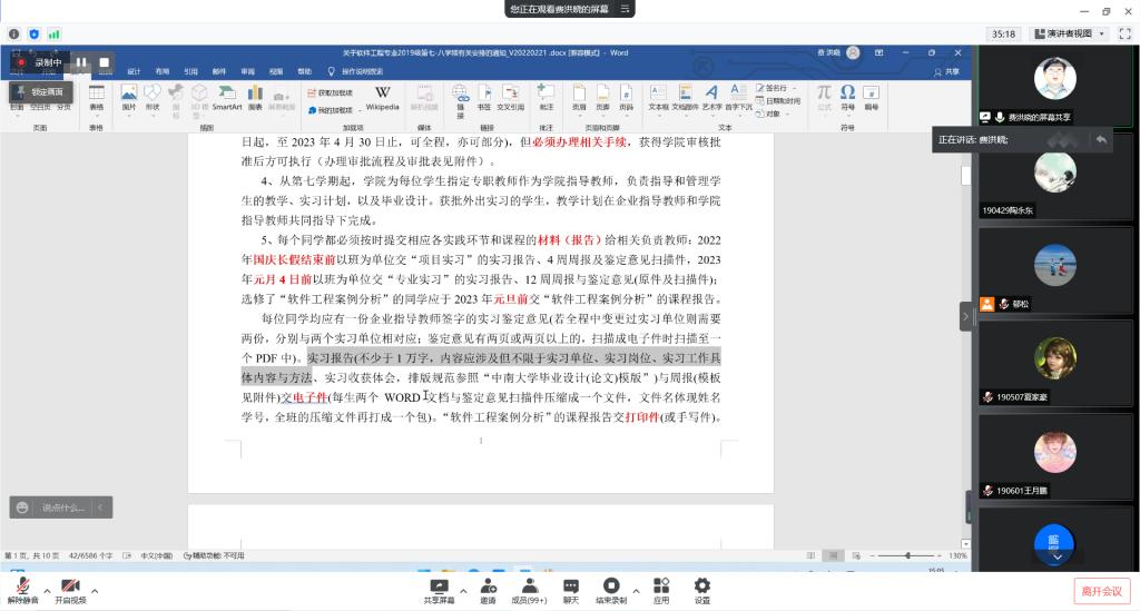 党委副书记史建权、副院长奎晓燕、实习指导老师费洪晓和郁松、软件18级辅导员王睿卿、19级辅导员廖璠艺,以及软件19级全体同学。本次会议由费洪晓老师主持。