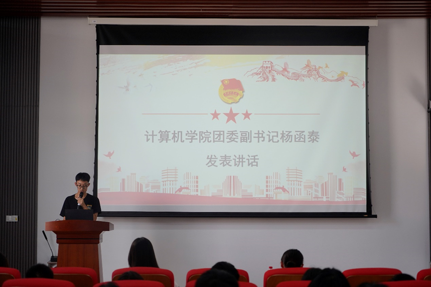团委副书记杨函泰介绍了此次召开大会的目的,强调不断提高团支部书记的能力是团支部蓬勃发展的关键,同时对新任团支书提出了自己的希冀:认真学习共青团知识,尽早熟悉团支书工作,为更好服务同学、建设团支部做出贡献。并在最后就“九·一八”事变向全体成员呼吁:作为共青团员,我们要时刻牢记落后就要挨打的教训,时刻牢记“坚定不移跟党走,为党和人民奋斗”的初心和使命,在新的历史征程上播撒青春,建立功勋!