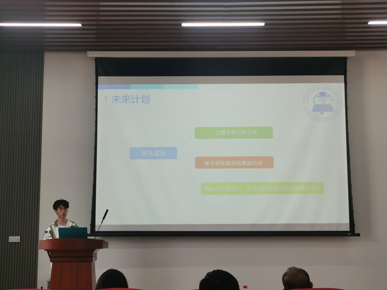 大会第二项议程——学服的工作介绍。在主持人蒋骏杰同学简单介绍完主席团成员后,学服各部长进行了自我介绍并对自己所在部门的工作从工作内容,工作成果以及工作收获三方面进行了介绍,让新干事对自己的工作有进一步的了解。同时,为了增进成员们对彼此的了解,主持人组织以“滚雪球记名”这种游戏的方式让新成员依次进行了自我介绍,活跃了会议氛围。
