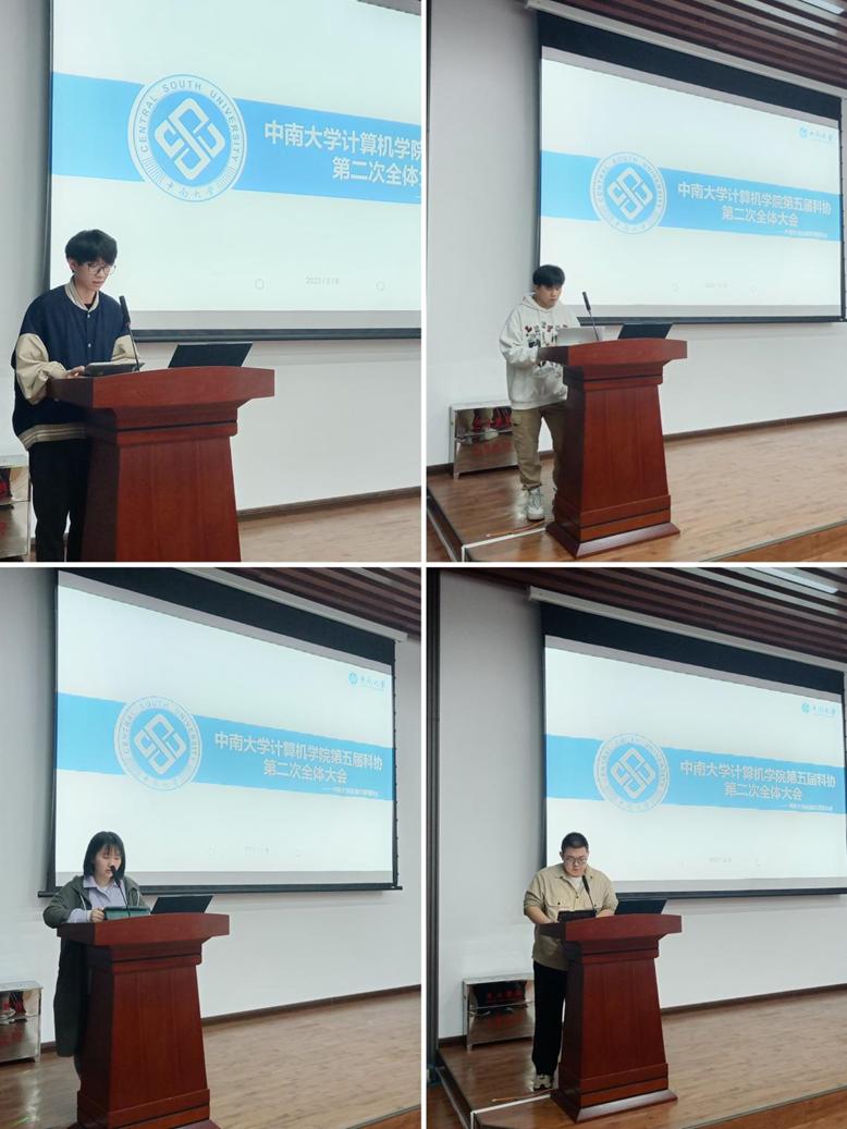 随后,各个部门的部长对本部门于上学期做的各项工作做出总结并对未来做出展望。管理部部长李超钒针对上学期科协财务及保研交流会等作出总结并对新学期的工作做出安排;竞赛部部长李东昊总结上学期软创比赛的成果并对下学期的服创比赛作出安排;交流部部长沈一蕊总结上学期IT训练营等活动的开展并规划下学期学习交流任务;双创部部长蒋仲尧对上学期的中期答辩等创业创新工作作出了总结。