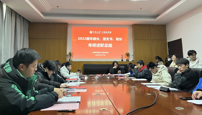 22级于1月15日在信息楼114举行年终述职总结会议,旨在全面总结学年工作,为后续年级工作的开展提供有效指导。会议由22级辅导员陈司宇老师主持,刘烁烁老师及22级全体年级长、团支书、班长参与。