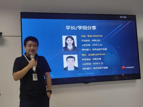 随后,来自华为软件业务产品部的两位中南大学校友,2020年入职的罗晟学姐和2010年入职的朱光辉学长,分享了他们在华为工作的经历和心得体会。学长学姐分别从自身角度讲述了华为的工作环境、职业发展路径以及在华为成长的点滴经验,为在场学生提供了宝贵的职业规划建议。