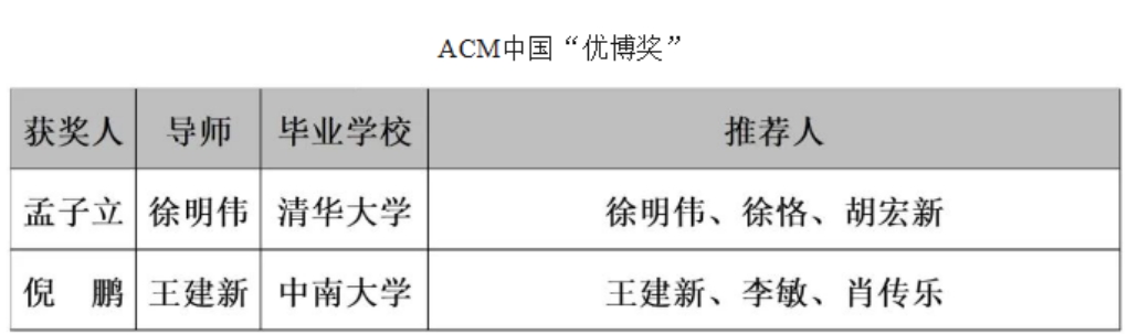 为表彰中国计算机领域的博士生所取得的研究成果,进一步推动青年学者在科研领域的发展和进步,ACM中国理事会从2014年起设立ACM中国“优博奖”,每年评选出不超过2名在相关领域获得突出科研成果的博士毕业生获得该奖项。