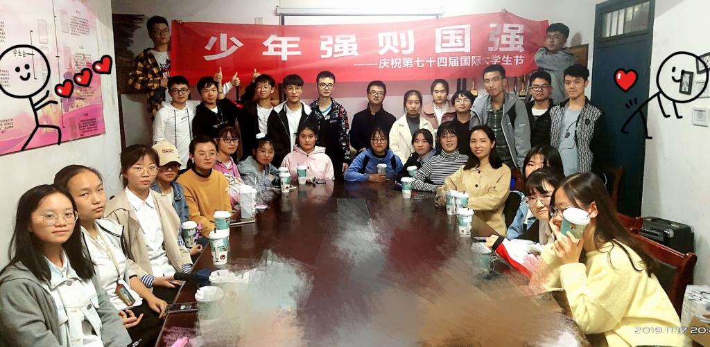 最后,为庆祝计算机1916班第一次班委会顺利召开及第七十四届国际大学生节,班长蔚永正带领同学们集体拍照留念。