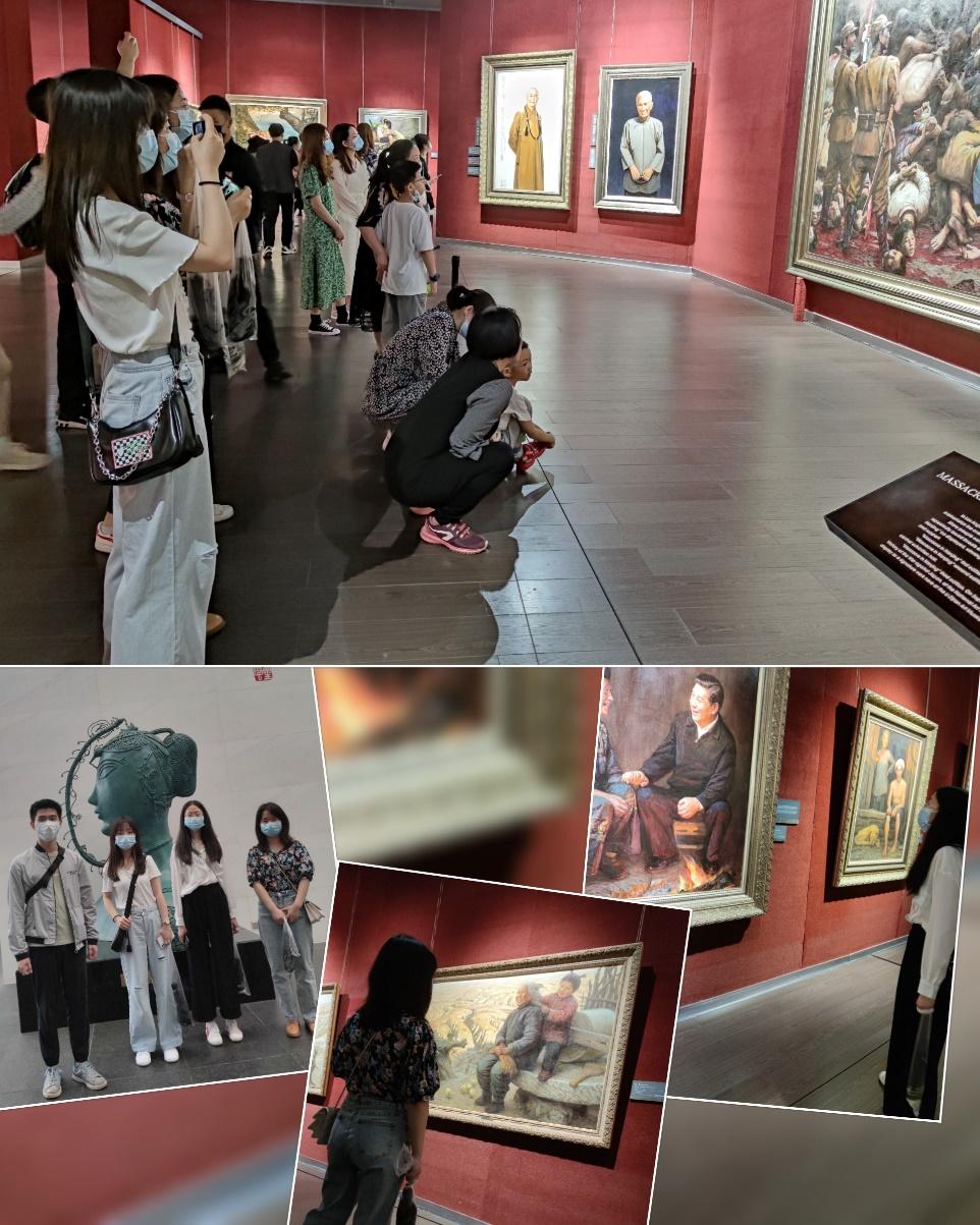 班长在窗口领取入馆门票之后,引领同学们有序入场,并充当起馆内讲解员。馆内展厅中分为乡土系列、母女系列、人物系列等等,这些系列画作展现了李自健大师在油画领域的高深造诣。李自健创作的《南京大屠杀》,用两个狞笑的日本军官,一个哭喊的婴儿与一名收拾尸体的僧侣真实再现了当年南京大屠杀的惨状,深深触动了大家的内心。