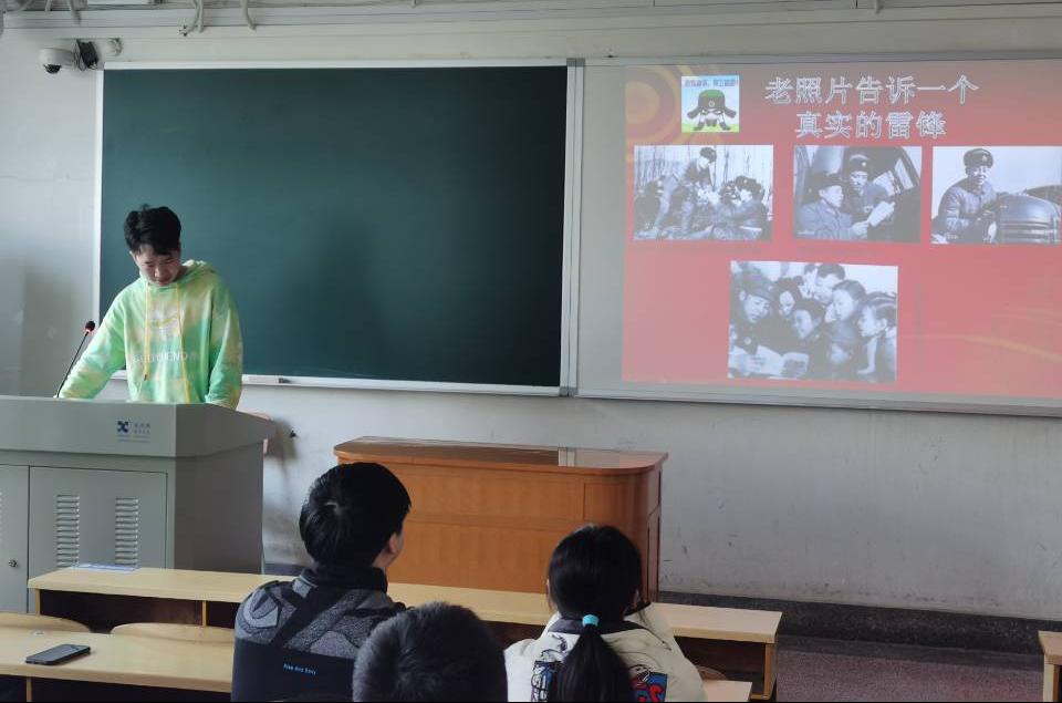 活动伊始,团支书通过雷锋的光荣事迹对雷锋精神加以阐述。雷锋精神突出表现为始终保持昂扬的精神状态和勇往直前的革命干劲,在平凡的岗位上作出不平凡的成绩,用生命践行为共产主义事业毕生奉献的誓言。