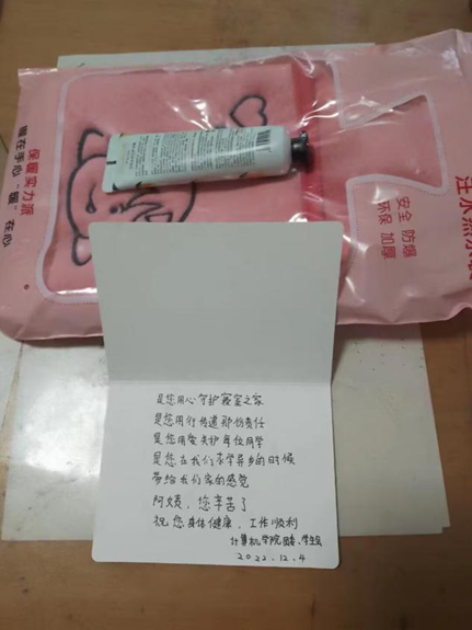 最后,志愿者们送上精心准备好的礼物,并与宿管们一起合影留念。