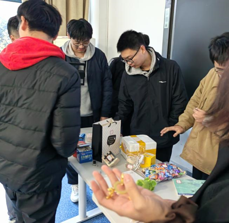 沉甸甸的纸箱装载着同学情,被依次传递到每一位同学手上,待到号码卡牌全部被取出后,黄珂馨同学邀请大家登上讲台一起认领号码牌所对应的礼物。在这一环节中,同学们收获了惊喜,加深了友谊,愉悦了心情。