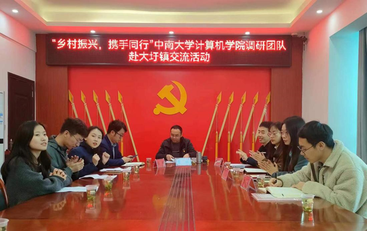 江华县县委常委、副县长殷新、大圩镇镇长陈飞、中南大学驻长山村乡村振兴工作队队长曹斌、大圩镇党委副书记高辉及中南大学第24届研究生支教团成员周婕、皮特、侯佳琪、周子霖在镇政府热情接待了中南大学调研团师生,并开展座谈会,就乡村振兴、大学生支教活动进行分享交流。