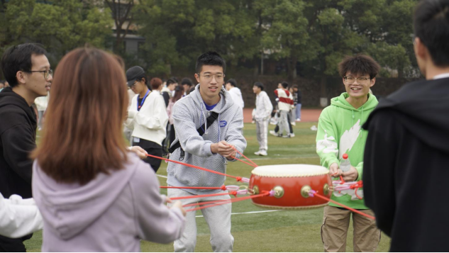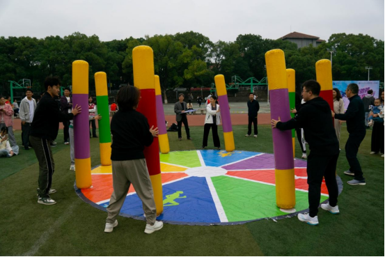 与此同时,教职工趣味项目也在热火朝天地进行着。教职工趣味项目一共分为“趣味飞盘”、“齐心协力”、“屹立不倒” 、“共赴未来”、“快乐一起拼”五个项目,教师与学生在同一个赛场挥洒汗水,收获快乐,互动感满满,也展现了教职工积极进取、团结拼搏的精神风貌。
